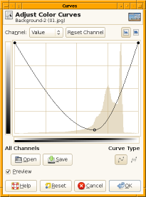 The photograph was taken in April 2010 in Denmark. The camera used was a Nikon D700 with a Nikkor 70-200mm 1:2.8 lens (set at f = 165 mm). Creation of the solarized image was done by applying GIMP’s Curves tool to the image, see screen shot. The minimum of the curve is at x = 165, y = 10 (on a scale from 0 to 255). The Levels tool was partially applied to increase contrast, i.e. the layer was duplicated, Levels was set to Auto and applied to the upper layer which was then set to 80 % opacity and merged with the lower layer. The 4256 x 2832 pixel image was cropped to 3200 x 2500 px (aspect ratio 1.28) and scaled down to 1500 x 1000 px (aspect ratio 1.5). Due to the different aspect ratios, the horizontal and vertical scaling factors are different, making the structure appear broader and increasing the tilt of the suspension insulators. The image was slightly sharpened (Unsharp Mask: Radius 1, Amount 0.30, Threshold 10) and converted to JPEG (Quality 95 %). |